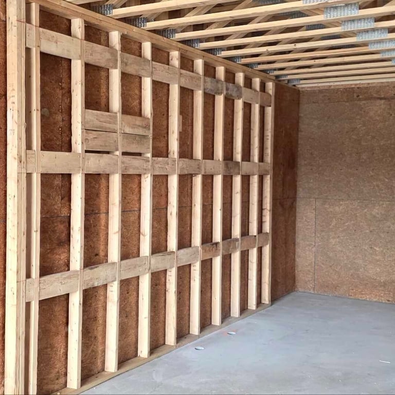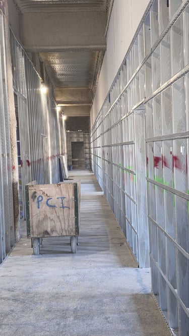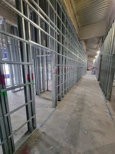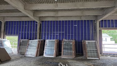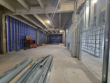 An important part of the interior framing is installation of RC channels, or resilient channels, within the interior walls. These structures are used to improve soundproofing in the walls, by separating the drywall panels from direct connection to the studs and joists. The next step for the interior space will be moving the drywall panels from storage to the site.