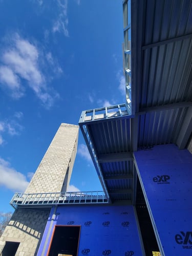 Wall girts will be placed once the primary frame is set. These steel elements attach to the columns and will transfer the load of the future wall panels to the primary frame and resist the wind load. Steel joists will be placed between the floors to cover the spaces between the main beams and support the future floor deck.