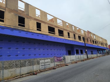 The vertical construction is now complete, and all floors are in place for this new 52-unit multi-family residential and mixed-use building, with the completion of the 3rd and 4th floor exterior walls. Currently, the final roof structure is being installed, and the building will soon be entirely under roof!