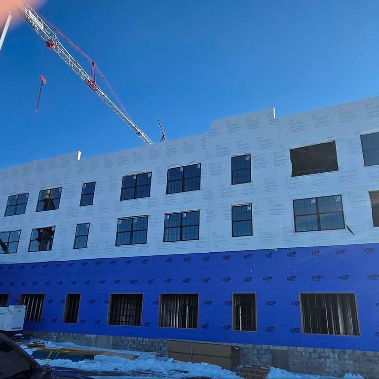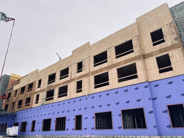 During the window installation, Tyvek® is being installed on the upper floors. This durable, lightweight, and breathable material is made from high-density polyethylene fiber. It is not woven, so it allows water vapor to escape, yet acts as an effective barrier that will protect the interior from water damage. The wrap also acts to enhance energy efficiency once the building is completed. The addition of Tyvek® as the building wrap will keep the interior structure dry and help to maintain heat during the winter and cooling during the summer months. Over the coming weeks, the window and Tyvek® installation will continue.