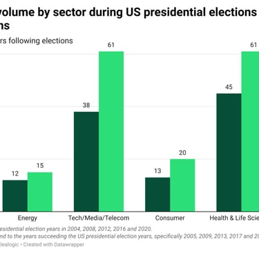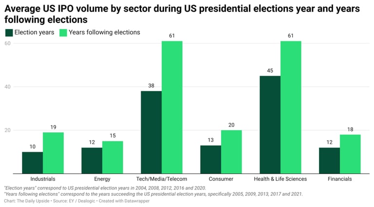 But what about the five years — 2005, 2009, 2013, 2017 and 2021 — immediately after those election years? The average US IPO volume was 194, a roughly 50% increase. Nothing like the clarity of an election result, no matter the victor, to give executives one less variable to worry about.