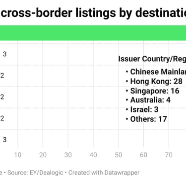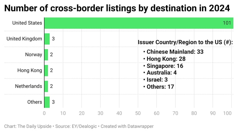 There is nevertheless little doubt that the US remains the world’s most alluring market. Cross-border listings —when a company trades on its home country’s stock exchange as well as a foreign exchange — rose to 113 this year, up from 83 in 2023. The US was the destination country for a staggering 101 of them (the 33 Chinese mainland firms led those that listed in the US from abroad, followed by 28 from Hong Kong, 16 from Singapore, and four from Australia).